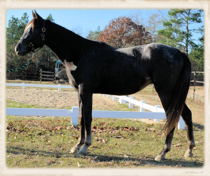 A tall, dark and handsome two year old Sport prospect. Deal may develop more Appaloosa coloring as he matures, but at this point he is solid colored.  Deal has his lifetime USEF number and will be microchipped.