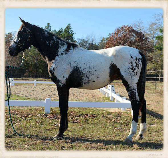 A tall, dark and handsome two year old Sport prospect. Deal may develop more Appaloosa coloring as he matures, but at this point he is solid colored.  Deal has his lifetime USEF number and will be microchipped.